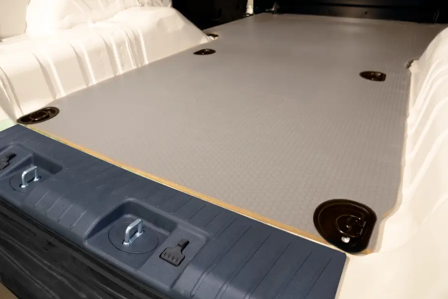 Der Boden ist das Fundament des Laderaums. Mit unserem modellspezifischen Schutzboden erhalten Sie einen robusten Schutz vor Abnutzung. Darüber hinaus ist er eine perfekte und stabile Basis für die Verankerung anderer Innenausstattungen. Unsere Schutzböden werden aus 9 mm Birkensperrholz mit einer speziellen Beschichtung für Feuchtigkeits- und Rutschfestigkeit hergestellt. Der Boden wird bei Bedarf mit einem verstärkten Kantenschutz an den Eingängen geliefert. Für Automodelle, die über originale Boden-Ladeösen verfügen, sind versenkte Ladeösen im Lieferumfang enthalten.
