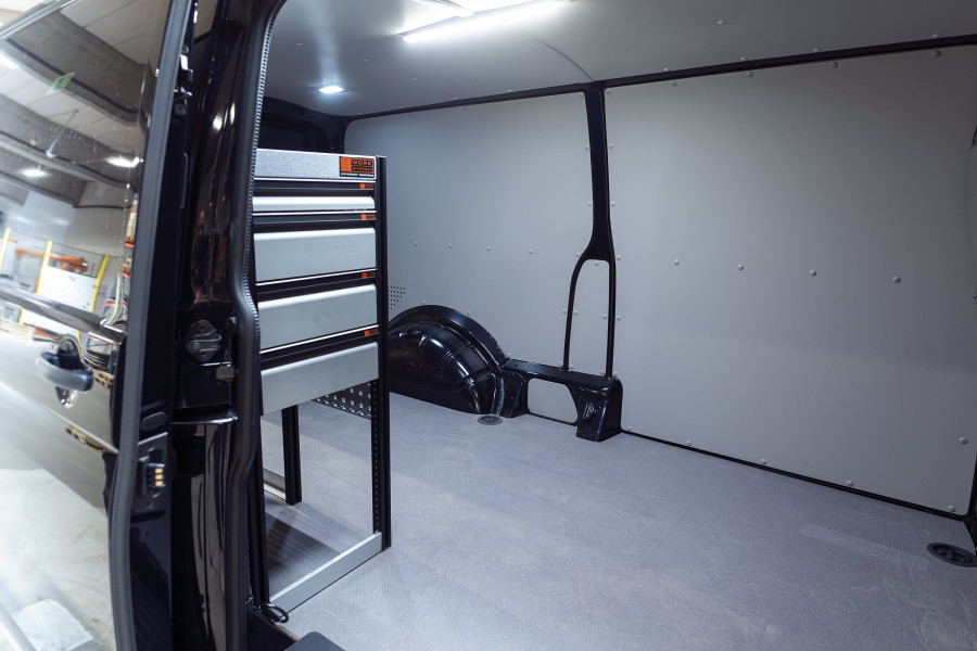 Fahrzeugeinrichtung mit leicht über die Seitentür zugänglichen kugelgelagerten Schubladen für den Expert, Jumpy, Vivaro, Scudo & ProAce L2.