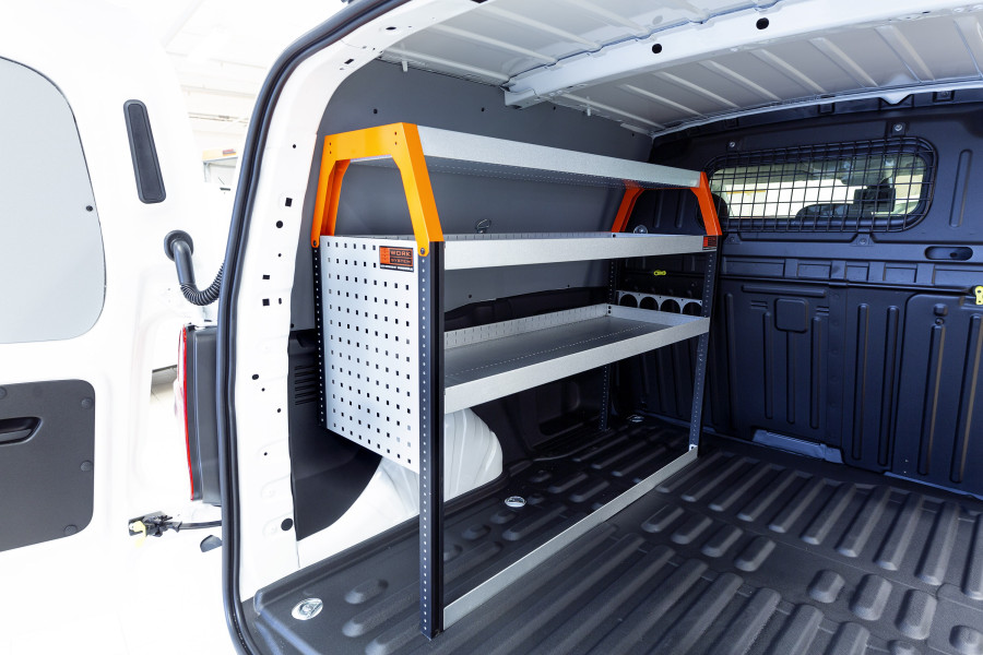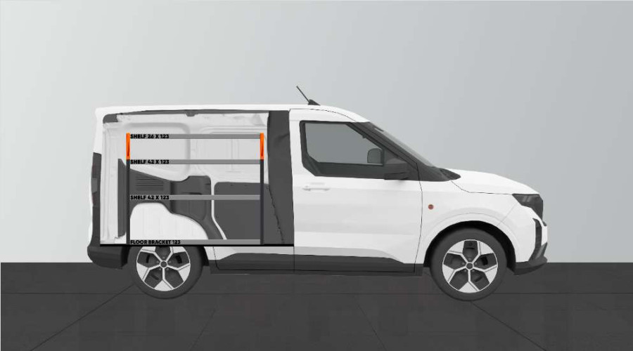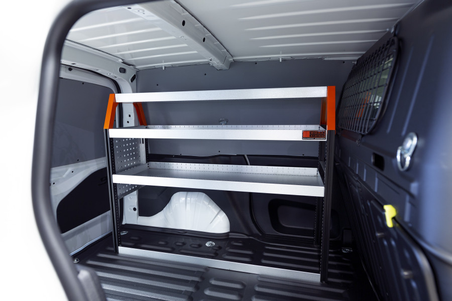 Eine Fahrzeugeinrichtung für Ihren Ford Courier L1, die gute Aufbewahrungsmöglichkeiten für Werkzeugtaschen/-koffer, Maschinen und Kleinteile bietet. Die Regalböden der Einrichtung haben eine Tiefe von 420 mm, dank derer sich die meisten auf dem Markt erhältlichen Werkzeugtaschen/-koffer problemlos verstauen lassen. Das obere Regal mit 262,5 mm wird oft durch unsere Modulboxen ergänzt, um Platz für die Aufbewahrung von Kleinteilen zu schaffen. Vergessen Sie nicht, die Werkzeugtafel der Regalwand zu nutzen.