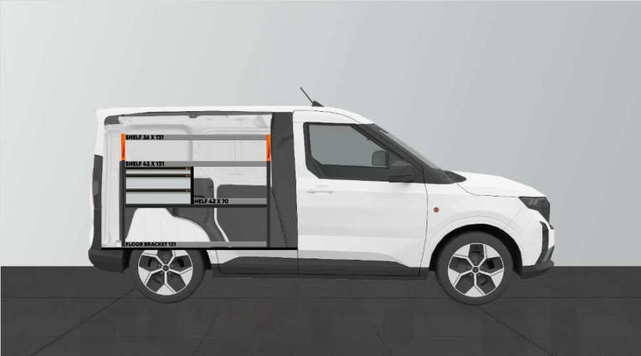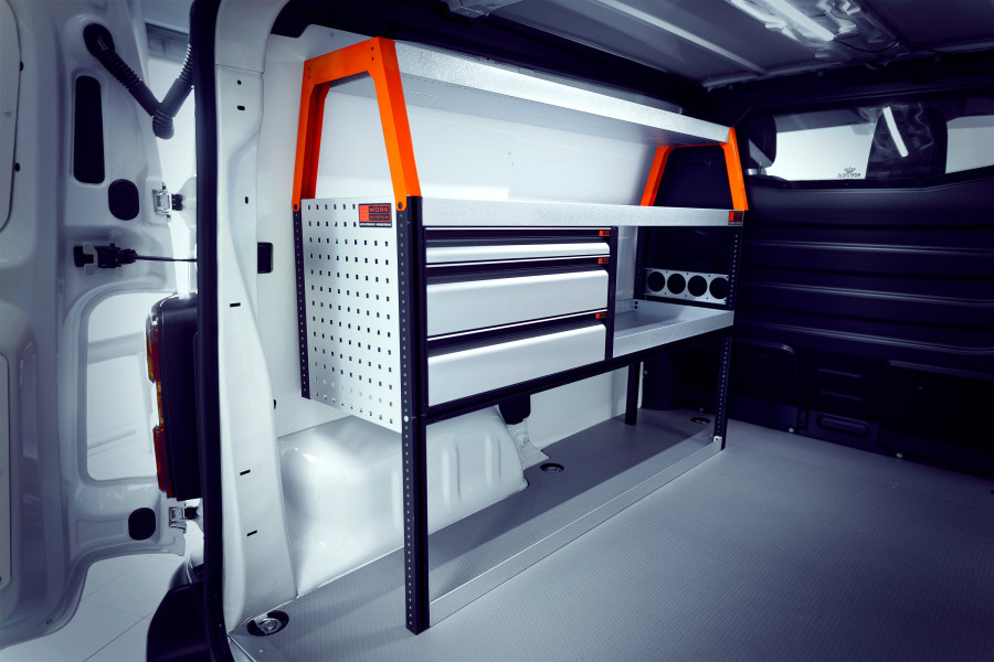 Dies ist eine unserer beliebtesten Fahrzeugeinrichtungen für den Ford Courier L1. LS3 – Die Einrichtung wird u. a. von Hausmeistern, Servicetechnikern, Elektrikern, Heizungs- und Sanitärinstallateuren und Tischlern genutzt. Die Einrichtung bietet gute Aufbewahrungsmöglichkeiten für Werkzeugtaschen/-koffer, Maschinen, Verbrauchsmaterialien und Ihr Kleinteilsortiment. Die Schubladen werden oft durch unsere Schubladeneinsätze und Trennwände ergänzt. An den Regalwänden lässt sich durch unsere Smartboxen zusätzliche Staufläche gewinnen.