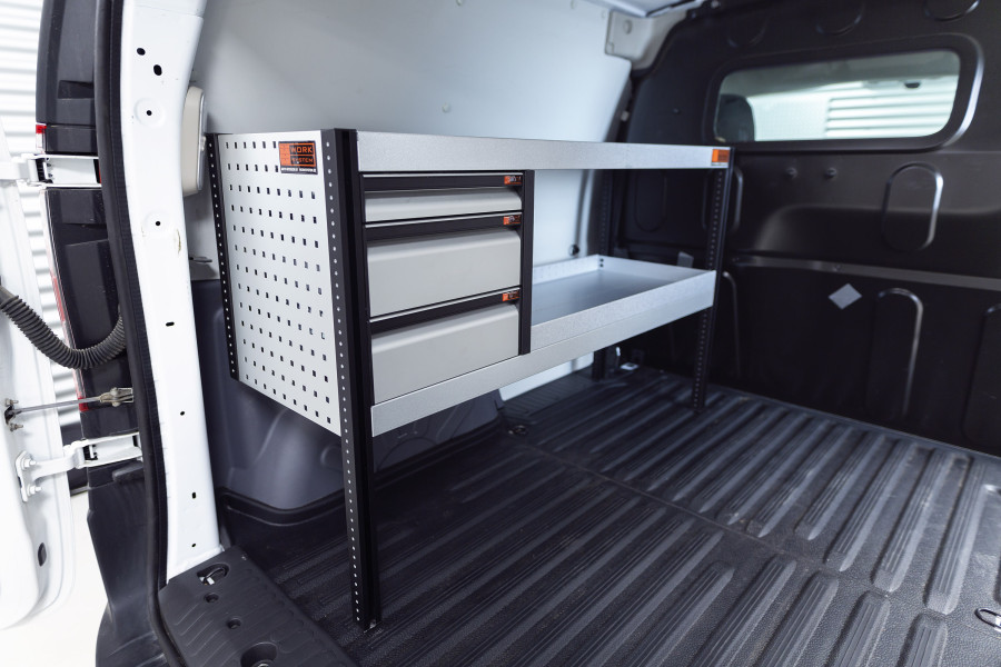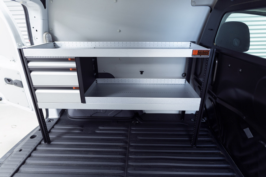 Mit der Serie Work System V-LS3 bieten wir Ihnen ein Fahrzeugregal für Berlingo, Combo, Proace City & Partner L2, bestehend aus einem Regal mit drei Schubladen, ausgestattet mit Kugellagerschienen.