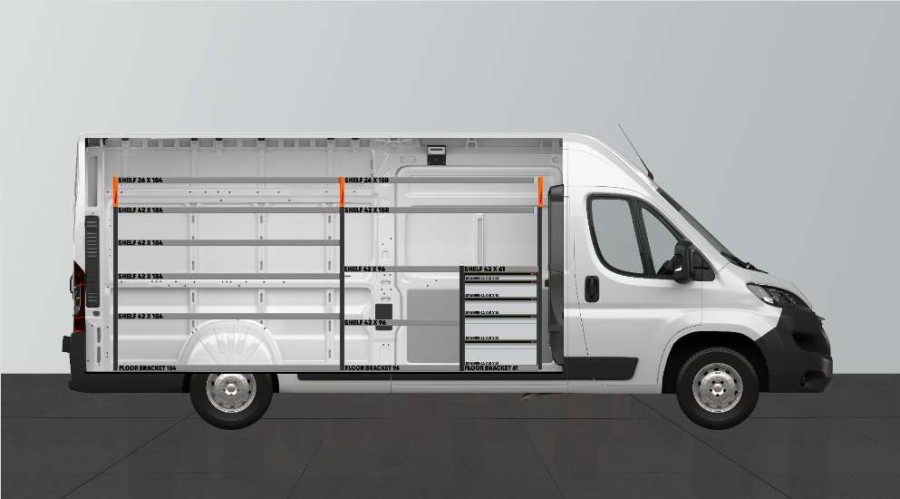 Detta är en av de mest populära systemen till Proace Max, Peugeot Boxer och Citroen Jumper L4H2. Inredningen ger bra förvaringsmöjligheter för såväl dina verktygsväskor, maskiner som ditt mindre sortiment. Du får en lådhurts med 5 st lådor i varierade storlekar för att ge var sak sin plats. Lådorna på kullagerskenor är populära att komplettera med våra nya sortimentlådor för att skapa bästa struktur. Att komplettera gaveln med våra nya Smartbox brukar också vara ett populärt alternativ för att maximera förvaringsutrymmet. Fördelad lastvikt i lådorna på kullagerskenor är 35kg/st. Lådornas innermått är (mm) B-579, D-387, H-60, H-130 samt H-200.