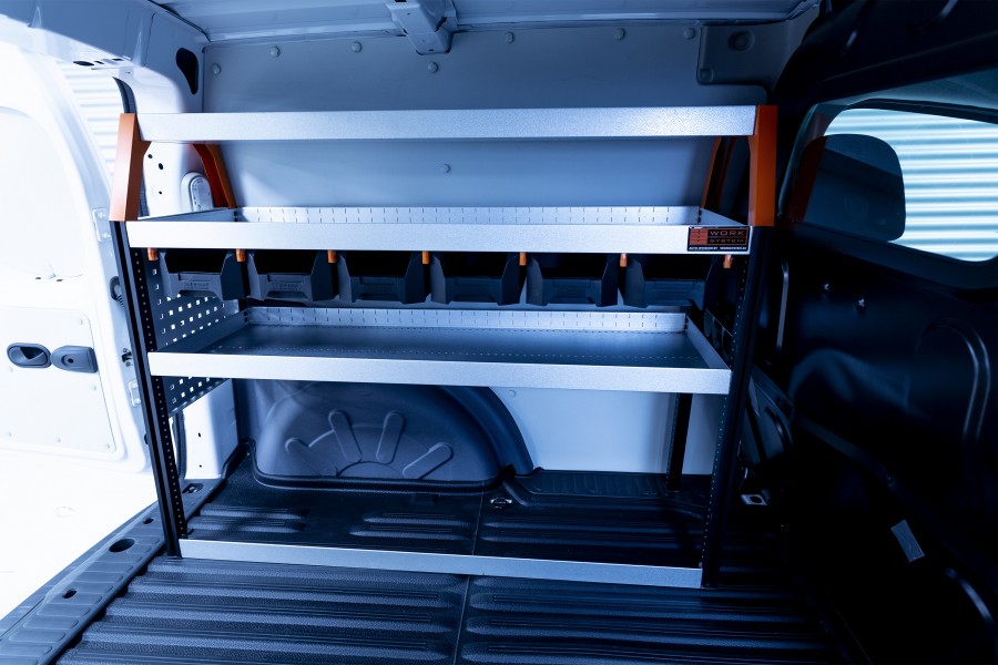 Work Systems neue Serie V-Basic+ für Citan Lang, NV 250 L1 & Kangoo Standard besteht aus einem Fahrzeugregal und zusätzlichen, hängenden Modulboxen zum Ausziehen.