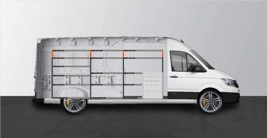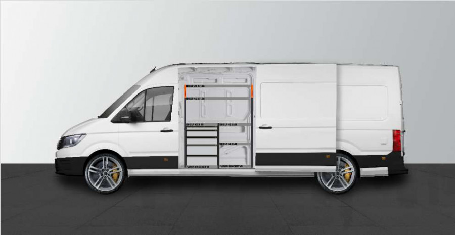 Dies ist eines der beliebtesten Systeme für den MAN TGE & Volkswagen Crafter L4 mit Seitentür auf der Seite der Einrichtung. Die Einrichtung bietet gute Aufbewahrungsmöglichkeiten für Werkzeugtaschen/-koffer, Maschinen und Kleinteile. Sie umfasst eine Schubladeneinheit mit 5 Schubladen in verschiedenen Größen, damit jeder Ausrüstungsgegenstand seinen Platz erhält. Hinter den Schubladen befindet sich eine Werkzeugtafel, die zusätzliche Aufhängungsmöglichkeiten im Fahrzeug bietet. Die Schubladen auf Kugellagerschienen werden häufig durch unsere neuen Schubladeneinsätze und Trennwände ergänzt, um maximale Ordnung und Übersichtlichkeit zu gewährleisten. Die Regalwand wird gerne auch durch unsere Smartboxen ergänzt, um den Stauraum zu maximieren.