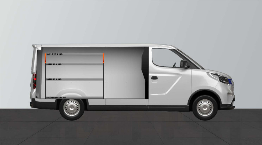 Eine kürzere Fahrzeugeinrichtung für Ihren Maxus e-Deliver 3 L2, die gute Aufbewahrungsmöglichkeiten für Werkzeugtaschen/-koffer, Maschinen und Kleinteile bietet. Die Regalböden der Einrichtung haben eine Tiefe von 420 mm, dank derer sich die meisten auf dem Markt erhältlichen Werkzeugtaschen/-koffer problemlos verstauen lassen. Das obere Regal mit 262,5 mm wird oft durch unsere Modulboxen ergänzt, um Platz für die Aufbewahrung von Kleinteilen zu schaffen. Die Einrichtung ist für Fahrzeuge mit und ohne Seitentüren geeignet. Vergessen Sie nicht, die Werkzeugtafel der Regalwand zu nutzen.