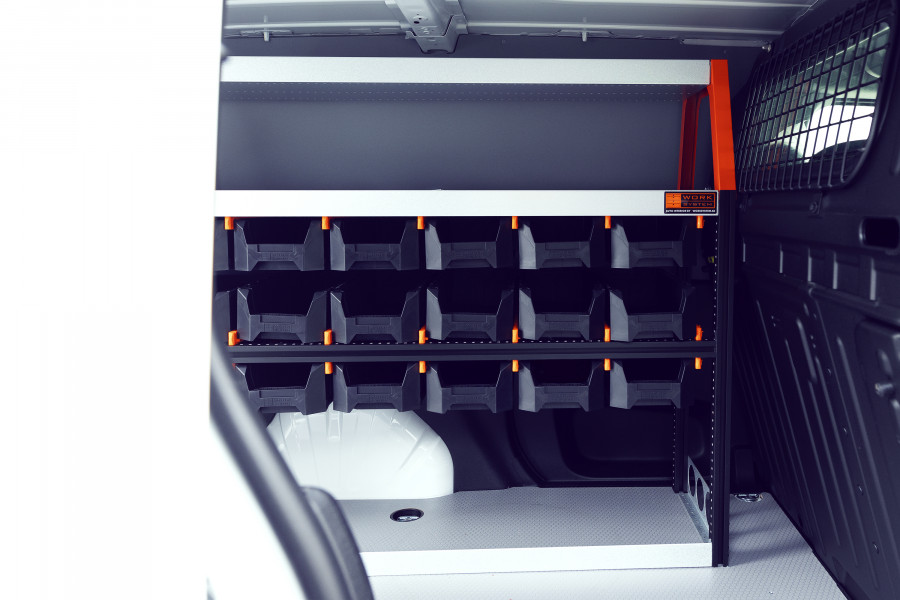 Mit der Serie Work System V-LS3 bieten wir Ihnen ein Fahrzeugregal für den Ford Custom L1, bestehend aus einem Regal mit drei Schubladen, ausgestattet mit Kugellagerschienen.