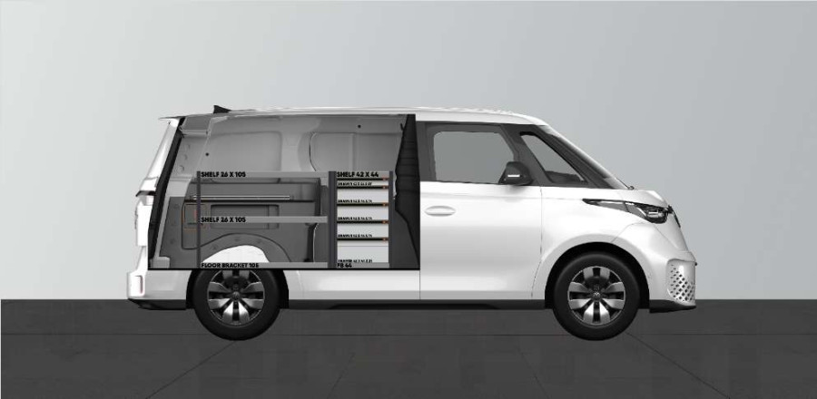 Mit dieser Fahrzeugeinrichtung erhalten Sie viel Stauraum in Regalen und Schubladen, geeignet für den VW ID BUZZ L1.