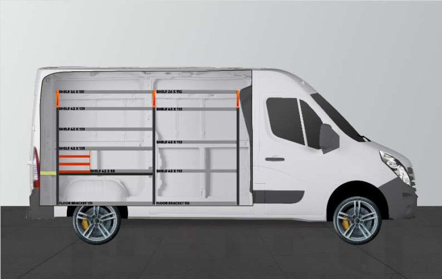 Eine beliebte Einrichtung für alle, die gute Aufbewahrungsmöglichkeiten für ihr Kleinteilsortiment sowie Werkzeugtaschen/-koffer und Maschinen benötigen. Diese Serviceeinrichtung enthält drei Sortimentskastenhalterungen, die an einen der beliebtesten Sortimentskästen auf dem Markt angepasst sind: Racco Carrylight. Die Einrichtung kann auf Wunsch um diese Sortimentskästen ergänzt werden. Die Fahrzeugeinrichtung passt perfekt zu Ihrem Opel Movano, Renualt Master & Nissan NV400.