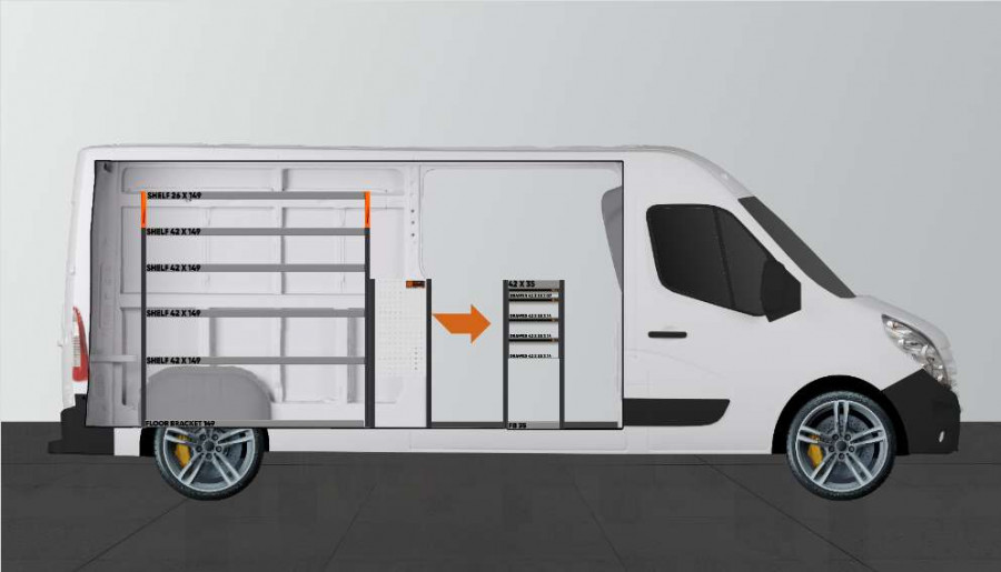 Eines der beliebstesten Fahrzeugregel für Ihren Opel Movano, Renault Master & Nissan NV400 L3. Die Einrichtung bietet vielfältige Aufbewahrungsmöglichkeiten, da die Schubladen auf Kugellagerschienen einen einfachen Zugang über die Seitentür bieten; die Schubladen können in Fahrtrichtung herausgezogen werden, um eine gute Übersichtlichkeit zu bieten. Die Schubladen können um Trennwände ergänzt werden, um mehr Ordnung und Struktur beim Kleinteilsortiment zu schaffen. Unsere tiefen Regalböden bieten außerdem gute Aufbewahrungsmöglichkeiten für Werkzeugtaschen/-koffer und kleinere Maschinen. Das verteilte Ladegewicht in den Schubladen der Kugellagerschienen beträgt 35 kg/St. Die Schubladen-Innenmaße sind B: 308, T: 387, H: 60 und H: 130 (mm).