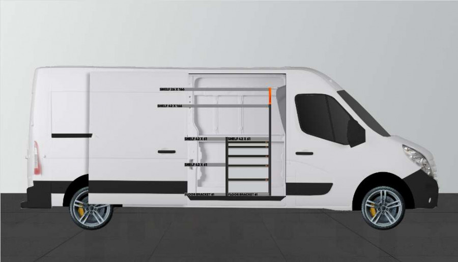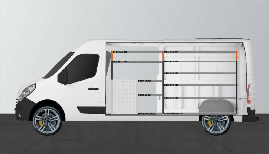 Dies ist eines der beliebtesten Systeme für den Opel Movano, Renault Master & Nissan NV400 L3 mit Seitentür auf der Seite der Einrichtung. Die Einrichtung bietet gute Aufbewahrungsmöglichkeiten für Werkzeugtaschen/-koffer, Maschinen und Kleinteile. Sie umfasst eine Schubladeneinheit mit 5 Schubladen in verschiedenen Größen, damit jeder Ausrüstungsgegenstand seinen Platz erhält. Hinter den Schubladen befindet sich eine Werkzeugtafel, die zusätzliche Aufhängungsmöglichkeiten im Fahrzeug bietet. Die Schubladen auf Kugellagerschienen werden häufig durch unsere neuen Schubladeneinsätze und Trennwände ergänzt, um maximale Ordnung und Übersichtlichkeit zu gewährleisten. Die Regalwand wird gerne auch durch unsere Smartboxen ergänzt, um den Stauraum zu maximieren.
