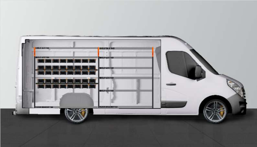 RACK ist eine neue, branchenführende Fahrzeugeinrichtung für den Opel Movano, Renault Master & Nissan NV400 L3. Sie eignet sich perfekt für alle, die eine gute Aufbewahrungsmöglichkeit für ihr Sortiment benötigen, z. B. Schrauben, Kupplungen, Bolzen, Bohrer usw. Die Einrichtung wurde um insgesamt 40 unserer neuen unterteilbaren Modulboxen erweitert. Die Modulboxen werden auf fest montierten Schienen herausgezogen, was einen einfachen Zugang ermöglicht. Die Front der Modulboxen ist so konzipiert, dass sie optimale Zugänglichkeit bietet. Die Kästen können durch ein transparentes Fenster und Querzwischenwände ergänzt werden, die alle 60 mm eingeschoben werden können.