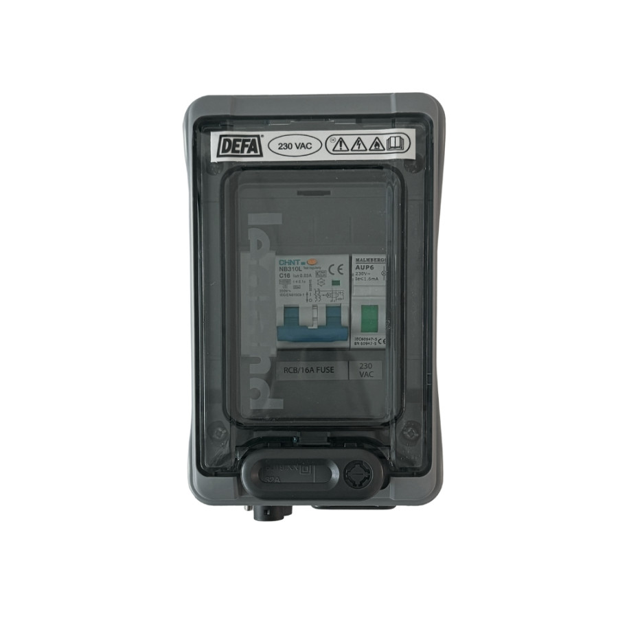 Verteilerkasten mit Sicherung und FI-Schalter. Die Hauptverteilung wird standardmäßig mit einem Schuko (Schwedischer Stecker, Standard) als Ausgang sowie DEFA-Kontakten für Ein- und Ausgang geliefert. Der Verteiler ist für eine Sicherung 230 V AC, 16 A ausgelegt. Der Verteilerkasten enthält einen „Sink Saver“, der die Kontaktkorrosion der Metalle verringert.