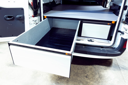 Optimieren Sie die Ablagemöglichkeiten im Fahrzeug durch einen Doppelboden. Die langen Schubladen geben einen guten Überblick über Ihr Material und Ihre Werkzeuge und sorgen für Ordnung und sicheres Verstauen.